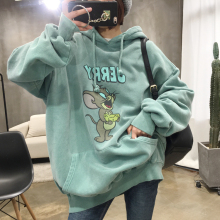 韩国东大门代购正品17春装宽松大码中长款复古卡通连帽卫衣女上衣
