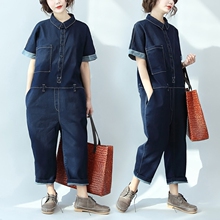 深蓝牛仔翻领短袖工装连体裤休闲文艺裤子 休闲宽松七分裤阔腿裤