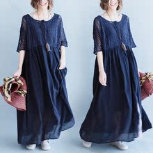 上钩织 下身皱麻 大摆文艺范棉麻连衣裙宽松长款长裙2017夏装新款