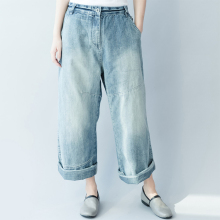 水洗打磨泛白灰蓝肥腿毛边牛仔裤宽松休闲九分裤 春夏季2017新款