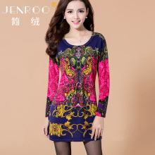 简绒2016春装新款女装羊毛裙印花长袖圆领打底毛衣中长款大码外套
