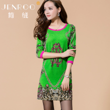 简绒2015春装新款女式中长款羊毛衫印花韩版长袖套头毛衣裙打底衫