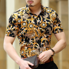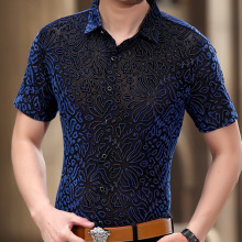 大花金丝绒男士短袖衬衫 春夏款时尚休闲镂空薄衬衣男中老年男装