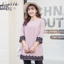 采多宝大码女装2017新款春装胖mm珍珠蕾丝T恤显瘦中长款小衫A9008