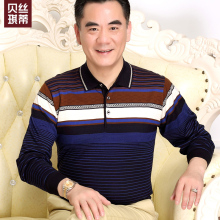夏新款中年男士体恤男长袖T恤中老年翻领商务爸爸装条纹恤男薄款