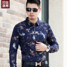 夏季男士印花丝光长袖衬衫男中年商务衬衣男长袖潮免烫衬衫男