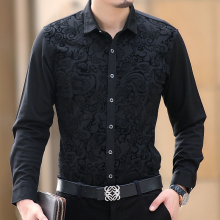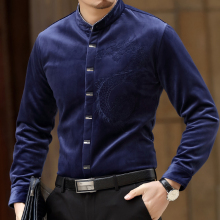 蓝色剑鱼 春装新款男士金丝绒长袖衬衫中年男装商务休闲衬衣时尚