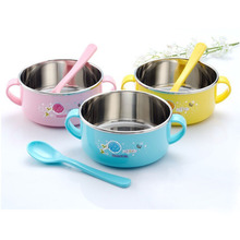 正品带手柄宝宝专用不锈钢碗 卡通隔热碗 不锈钢吃饭碗带勺