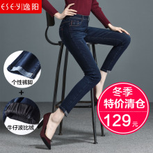 逸阳女裤2016新款冬季加绒牛仔裤女高腰加厚长裤弹力九分小脚裤子