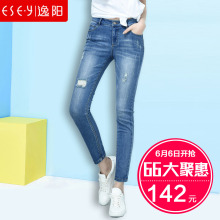 逸阳女裤2017夏新款破洞牛仔裤女九分大码修身弹力浅色铅笔裤薄款