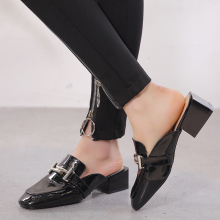 艾可茜尼2017新款金属扣PU凉拖女夏粗跟包头黑色懒人半拖鞋子