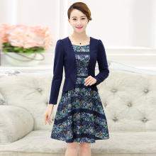 2017春秋妈妈装假两件修身套裙30-40-50岁中年女装优雅印花连衣裙