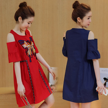 大码女装2017夏装新款女装绣花短袖露肩时尚印花连衣裙