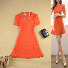 2件包邮女装17春夏新款韩版大码翘肩橘红色荷叶摆修身半袖连衣裙