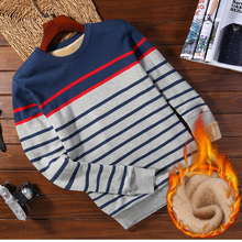 加厚秋冬男士毛衣潮流修身条纹加绒圆领青年休闲针织衫套头衫衣服