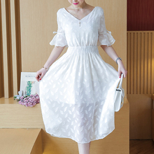 短袖v领连衣裙2017夏装新款韩版白色雪纺提花过膝长裙松紧腰a字裙