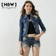 2017春季徽章贴布弹力牛仔外套女 欧洲站推荐做旧修身牛仔上衣潮