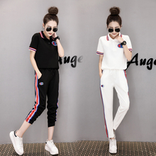 欧洲站2017夏装新款欧货时尚印花拼接短袖长裤休闲运动两件套装女