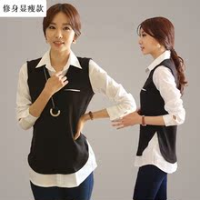 2016春秋装新假两件衬衣t恤 韩版大码女装长袖拼接修身显瘦OL上衣