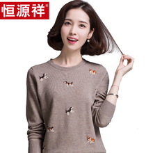 恒源祥女士纯羊毛衫春秋季打底针织衫修身圆领卡通薄毛衣长袖外穿