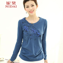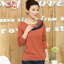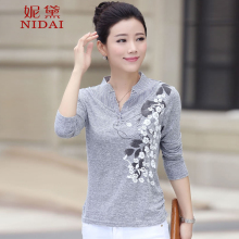 2017春装新款t恤女长袖修身绣花民族风中年妈妈装纯棉上衣打底衫
