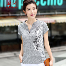 2017夏装新款t恤女短袖大码女装休闲宽松印花立领衬衫上衣打底衫