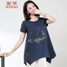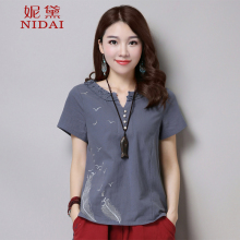 妮黛2017夏装新款棉麻短袖t恤女宽松大码圆领文艺绣花T恤亚麻上衣