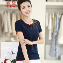 2017夏装新款纯棉T恤女短袖大码中年绣花圆领修身民族风打底t恤衫