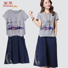 棉麻连衣裙宽松短袖T恤半身裙2017夏装新款大码休闲两件套装裙女