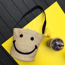 ulzzang新款韩国东大门包草编笑脸水桶包迷你流苏编织韩版女小包