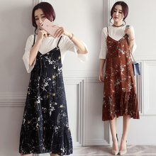 夏装新款2017韩版宽松印花吊带圆领连衣裙女百搭中长款两件套装