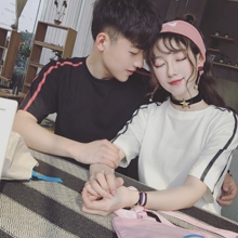 情侣装夏装2017新款韩版条纹短袖T恤潮宽松海魂衫学生班服纯棉tee