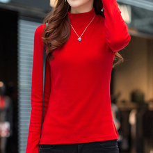 纯棉秋季女t恤大红色修身半高领长袖女装打底衫韩版上衣服大码潮