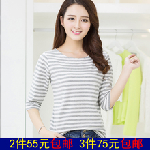 一字领七分袖条纹t恤女宽松大码中袖打底海魂衫纯棉韩范长袖上衣