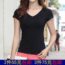 纯棉短袖女t恤韩版V领紧身纯色打底衫大码修身显瘦女士夏装衣服潮