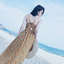 小心机交叉露背连衣裙海边度假碎花沙滩裙长裙无袖高腰印花背心裙
