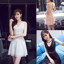 夏季新款女装性感露背收腰透视蕾丝连衣裙修身V领无袖背心裙a字裙