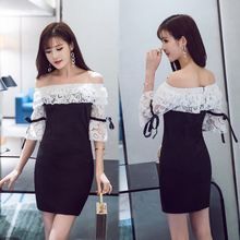 2017夏季新款蕾丝拼色一字肩性感露肩喇叭袖短裙修身显瘦连衣裙女