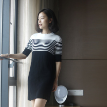 1945 夏装新款 显瘦复古圆领黑白配条纹针织连衣裙中袖