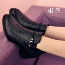 欧美春季新款加大码女鞋40-43金属镂空休闲鞋粗跟中跟单鞋41-43黑