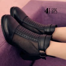 欧美春夏新款凉鞋圆头大码凉靴女40-43中粗跟镂空网纱女鞋41-43潮