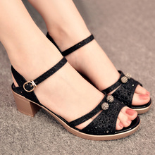 2016夏季粗跟中跟显瘦大码凉鞋女40-43休闲水钻搭扣鱼嘴女鞋41-43