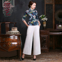 深艺 新款夏装女士唐装裤子日常棉麻长裤纯色优雅休闲中式阔腿裤