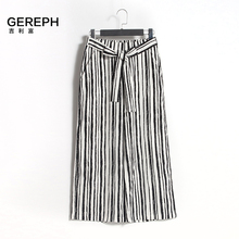 吉利富P817006阔腿八分裤棉麻系带蝴蝶结宽松黑白竖条纹夏薄长裤