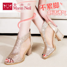 鱼嘴高跟鞋2017新款粗跟凉鞋女夏中跟 百搭鱼嘴鞋网纱夏季女鞋