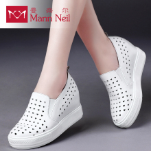 一脚蹬女鞋夏2017白色镂空内增高小白鞋 鞋子真皮厚底鞋女松糕底