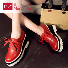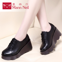 女鞋2017春系带简约小皮鞋女百搭真皮 厚底松糕鞋 坡跟单鞋女