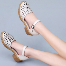 包头凉鞋女夏2017新款真皮粗跟罗马平底一字带凉鞋镂空复古女鞋潮