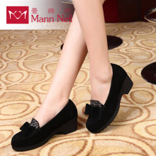 2017春秋松糕鞋女浅口软皮蝴蝶结单鞋女款真皮厚底鞋坡跟妈妈鞋