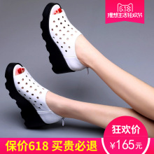 坡跟凉鞋女夏2017新款鱼嘴鞋子镂空松糕鞋真皮凉鞋防水台厚底鞋女